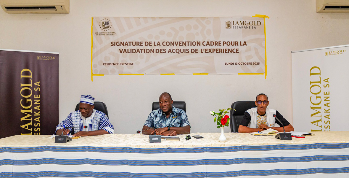 Le 13 octobre 2025, IAMGOLD ESSAKANE SA et la Direction générale des examens, de la certification et des concours ont scellé une convention cadre pour la validation des acquis de l’expérience des employés . Par cette approche la société qui célèbre ces 15 belles années de production au Burkina Faso ambitionne de pouvoir fournir aux employés qui n’ont pas un diplôme mais qui se sont formés et opèrent très bien à dans leurs postes d’obtenir un parchemin qui atteste de leur expertise dans un domaine spécifique.