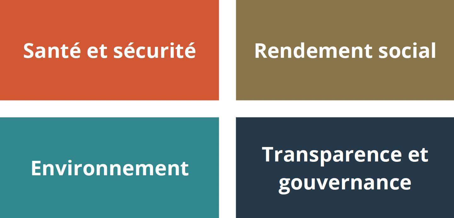 Notre stratégie préliminaire cible quatre piliers : la santé et la sécurité, le rendement social, l’environnement, ainsi que la transparence et la gouvernance. Nous définissons de nouveaux objectifs à long terme pour chacun de ces piliers et établissons des mesures clés pour progresser vers ces objectifs.
