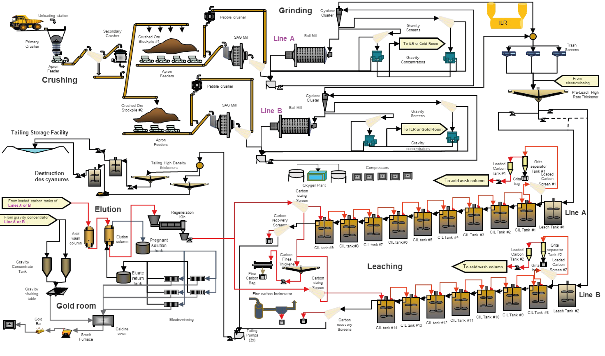 Le concentré gravimétrique alimente un réacteur de lixiviation intensive (ILR). Le concentré cathode obtenue dans le réacteur de lixiviation intensive est ensuite séché et fusionné avec le concentré cathode du circuit d'élution.