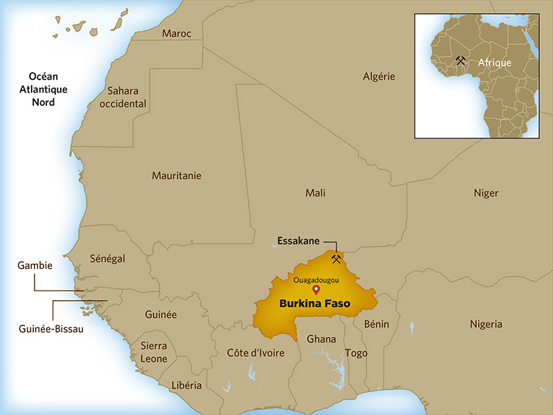 La mine Essakane est située dans la partie Nord-Est du Burkina Faso à 330 kms de la capitale Ouagadougou. Essakane se trouve dans une zone frontalière avec le Niger et le Mali. Elle chevauche les limites territoriales entre les provinces d’Oudalan et du Séno, dans la région du Sahel du Burkina Faso. Elle est située à 42 km à l’Est de la grande ville la plus proche et de la capitale provinciale de l’Oudalan, Gorom-Gorom.