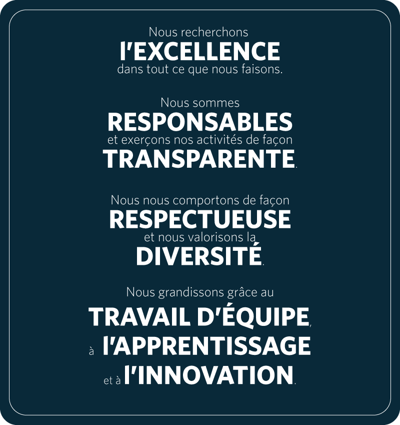 Nous cherchons la robustesse au travers des cycles avec une saine structure de coût, une gestion disciplinée du capital, en gérant les risques et en saisissant toutes les occasions afin de nous améliorer. Nous déployons de la valeur en innovant et en prenant des décisions d’affaires courageuses guidées par des pratiques exemplaires en matière de responsabilité sociale.